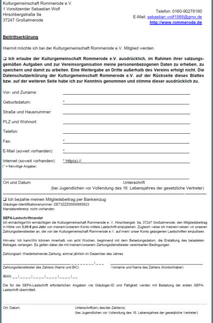 Mitglied werden in der Kulturgemeinschaft RommerodeDen Antrag auf Mitgliedschaft in der Kulturgemeinschaft mit dazugehöriger SEPA-Erklärung zum Einzug des Beitrags können Sie als PDF-Dokument ausdrucken oder herunterladen. Wir freuen uns auf Sie!