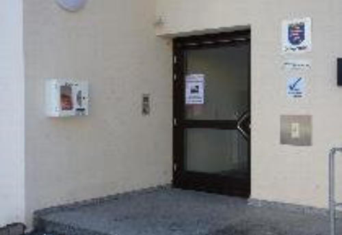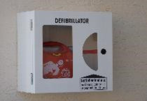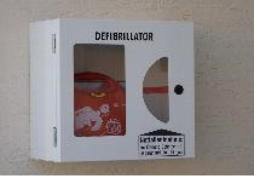 angeschaffte Defibrillator ist am barrierefreien Seiten-